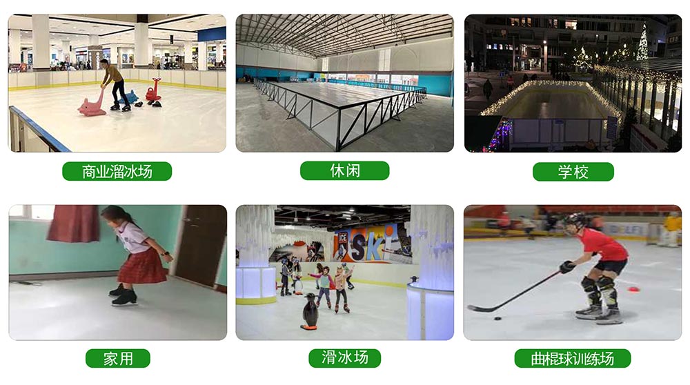 仿真冰板廣泛應用于冰球,花樣滑冰,常規溜冰,曲棍球等大小滑冰場、冰球場、曲棍球場及慶典、演出等公共場所、家庭運動場所。室內,室外都可以使用,且不受季節,場地和環境溫度的影響,拆裝方便,移動自如。